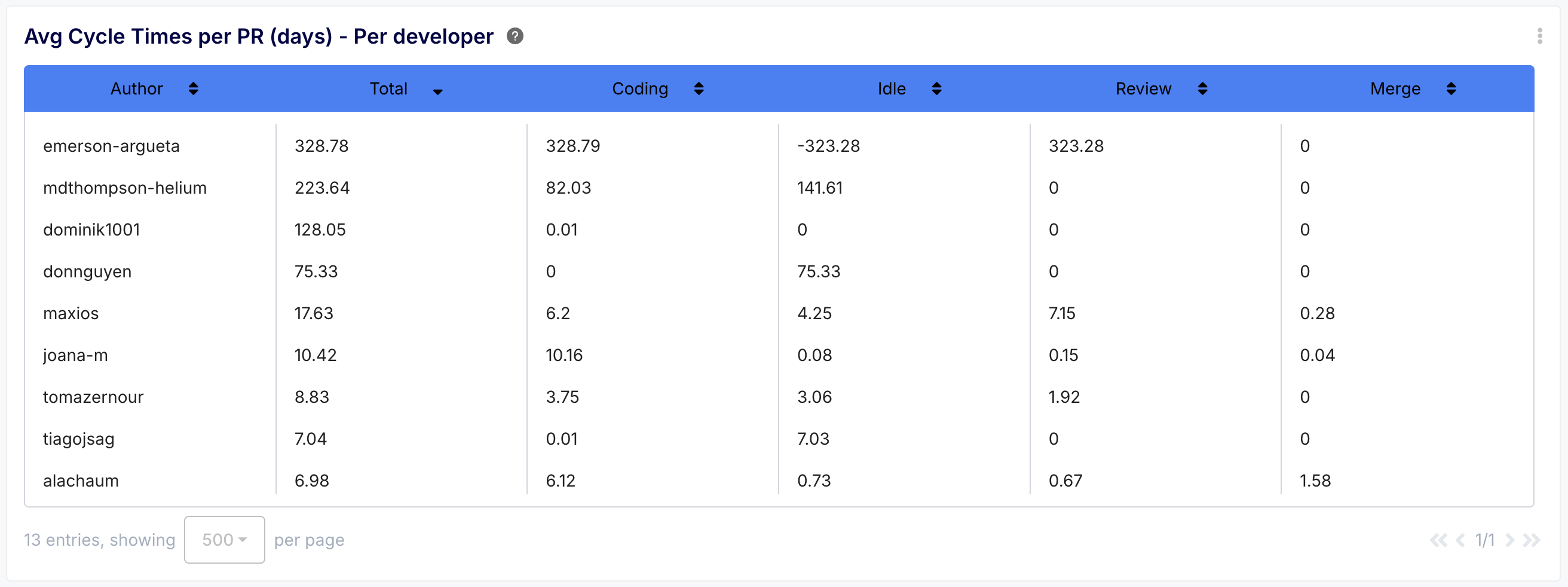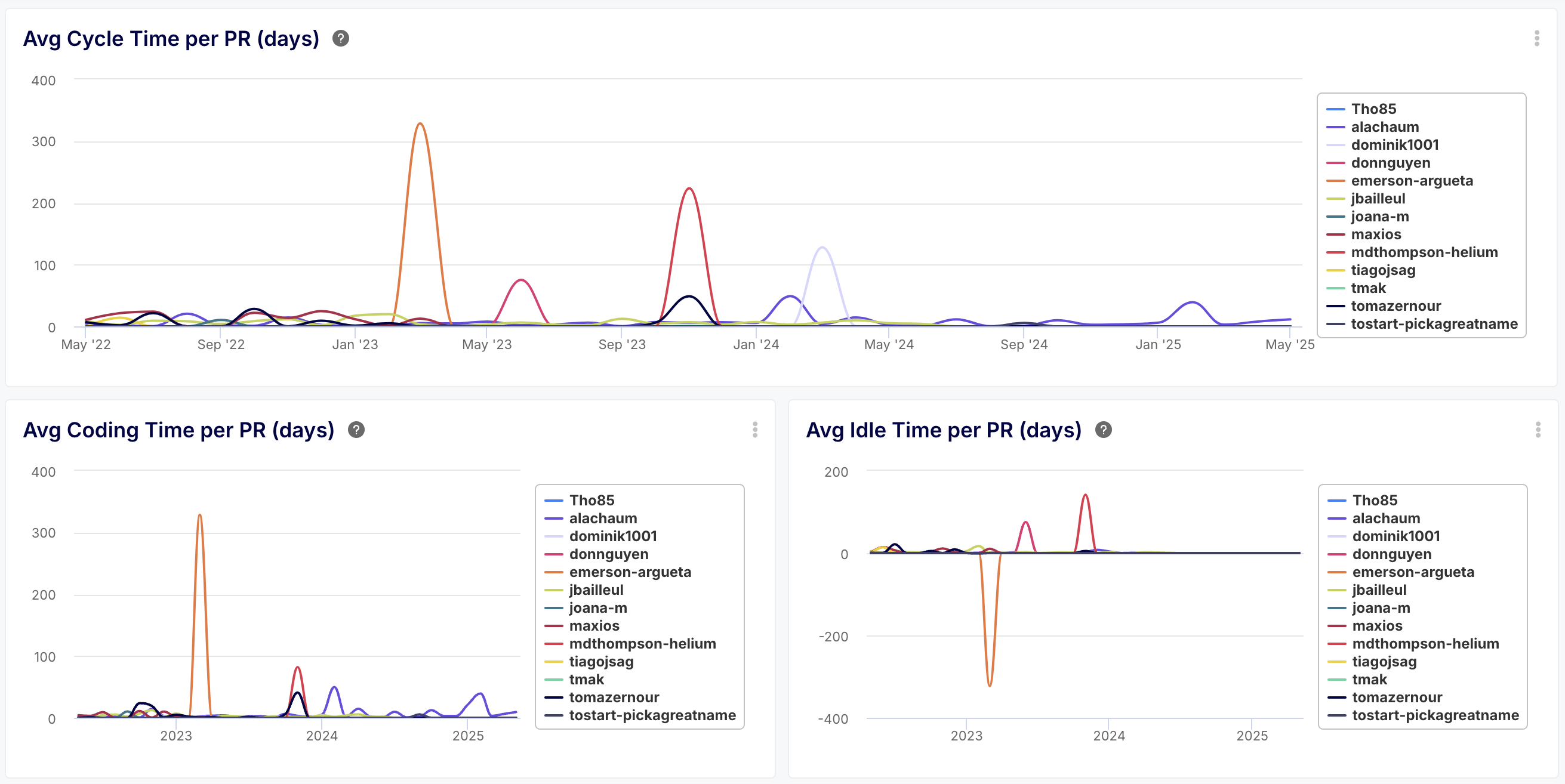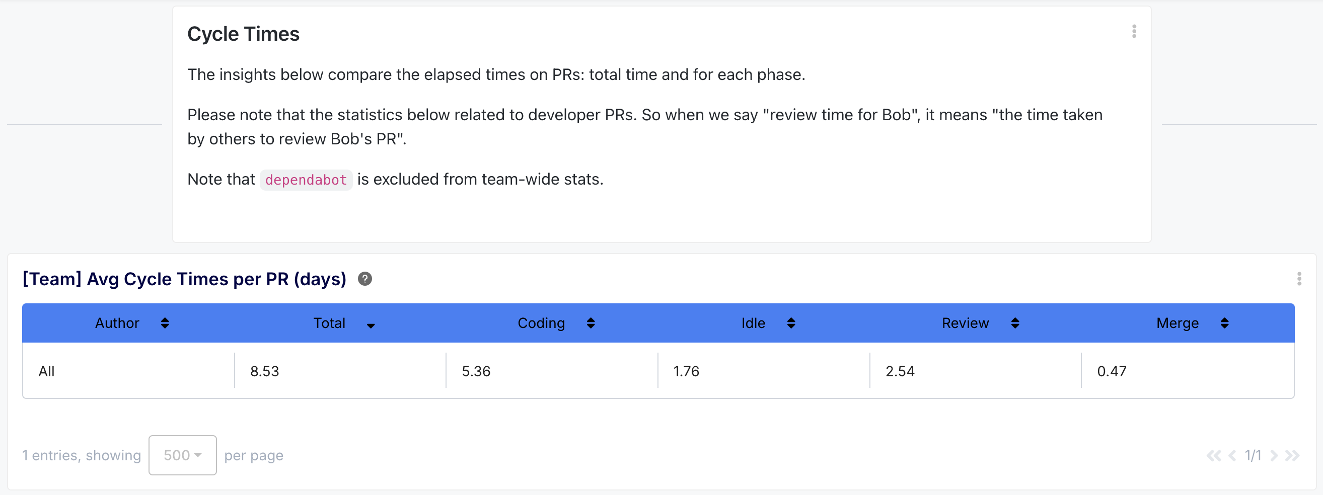 - What you get: Detailed breakdowns of average PR cycle times (Total, Coding, Idle, Review, Merge) for the entire team and each developer. Visualize trends over time.