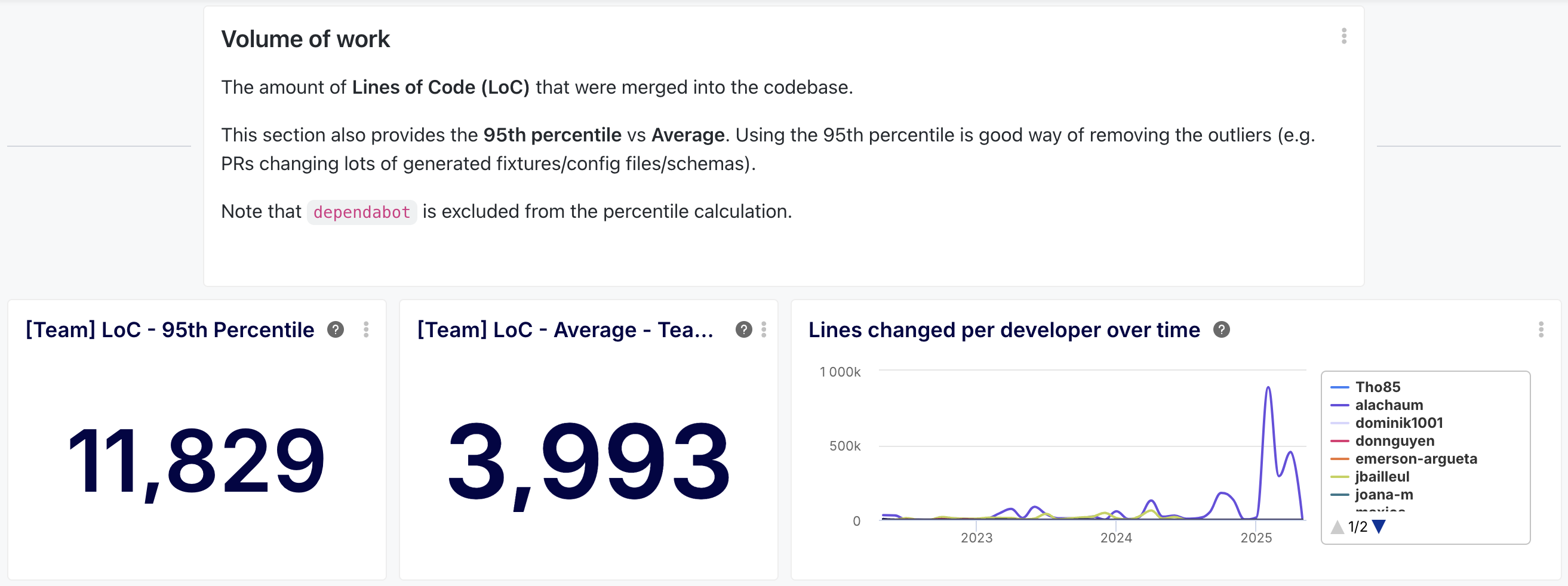 - What you get: Understand typical PR sizes (LoC) with team averages and 95th percentiles (to exclude outliers), plus individual LoC and commit trends.<br>