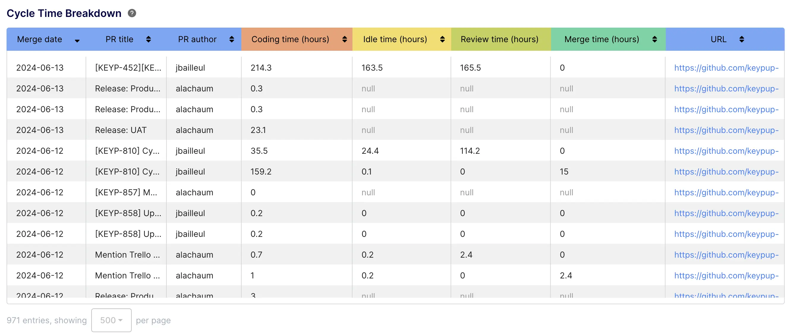 - Cycle Time Breakdown: Dive into detailed reports on specific pull requests to identify and address instances of extended cycle times, enabling focused improvements for a more agile delivery cycle.